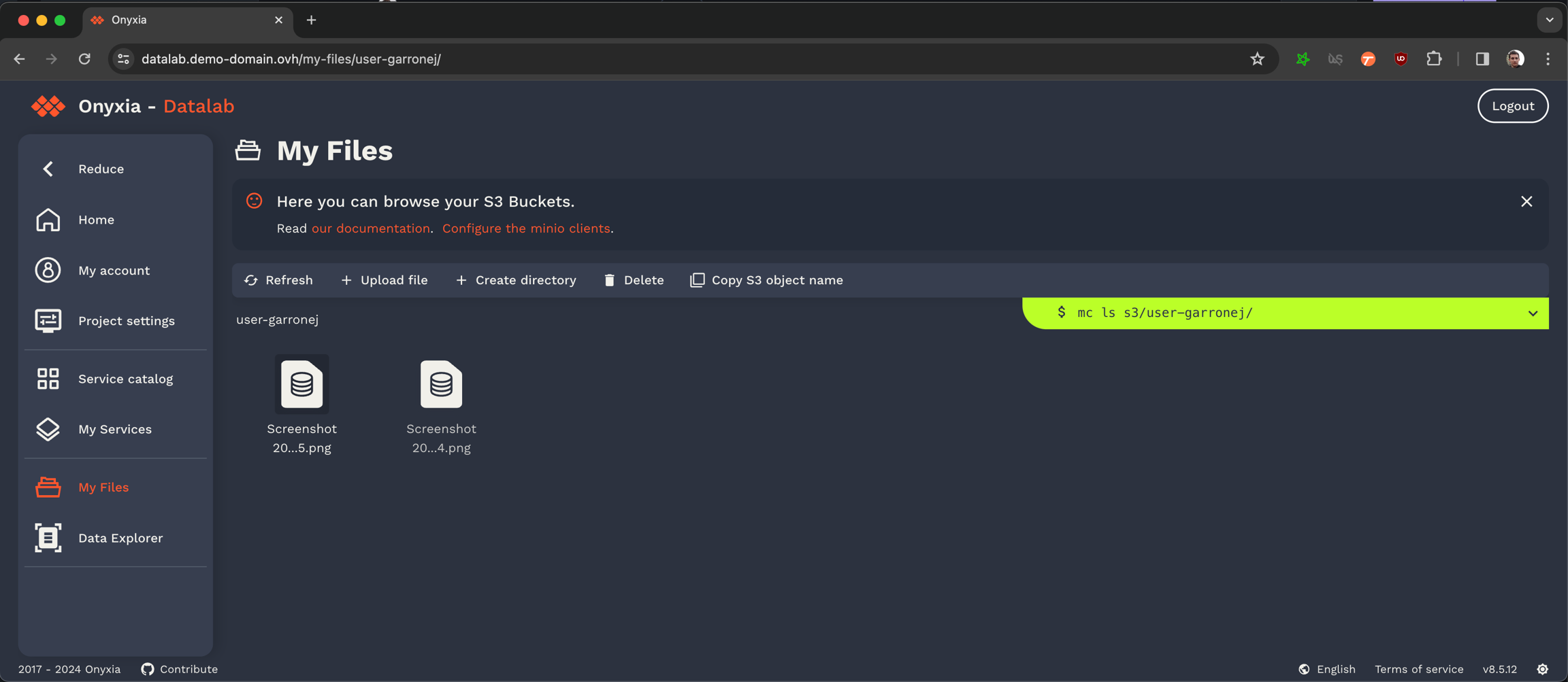 Congratulation, all the S3 related features of Onyxia are now enabled in your instance! Now if you navigate to your Onyxia instance you should have My Files in the left menu.