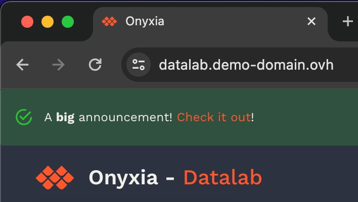 What's great, is that now, if you want to update the configuration of your Onyxia instance you only have to commit the change to your GitOps repo, ArgoCD will takes charge of restarting the service for you with the new configuration. To put that to the test try to modify your Onyxia configuration by setting up a global alert that will be shown as a banner to all users!