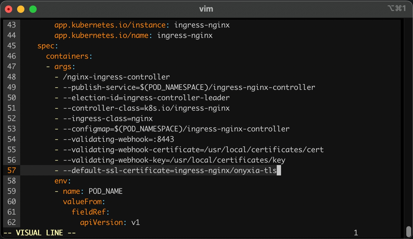 --cert /etc/letsencrypt/live/onyxia.$DOMAIN/fullchain.pemLastly, we want to tell our ingress controller to use this TLS certificate, to do so run: