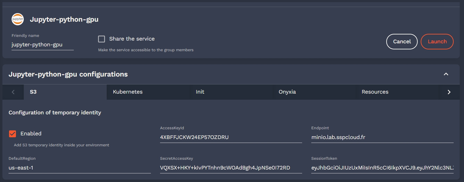 Users can edit various parameters. Onyxia do some assertion based on the charts values schema and the configuration on the instance. For example some identity token can be injected by default (because Onyxia connect users to many APIs).