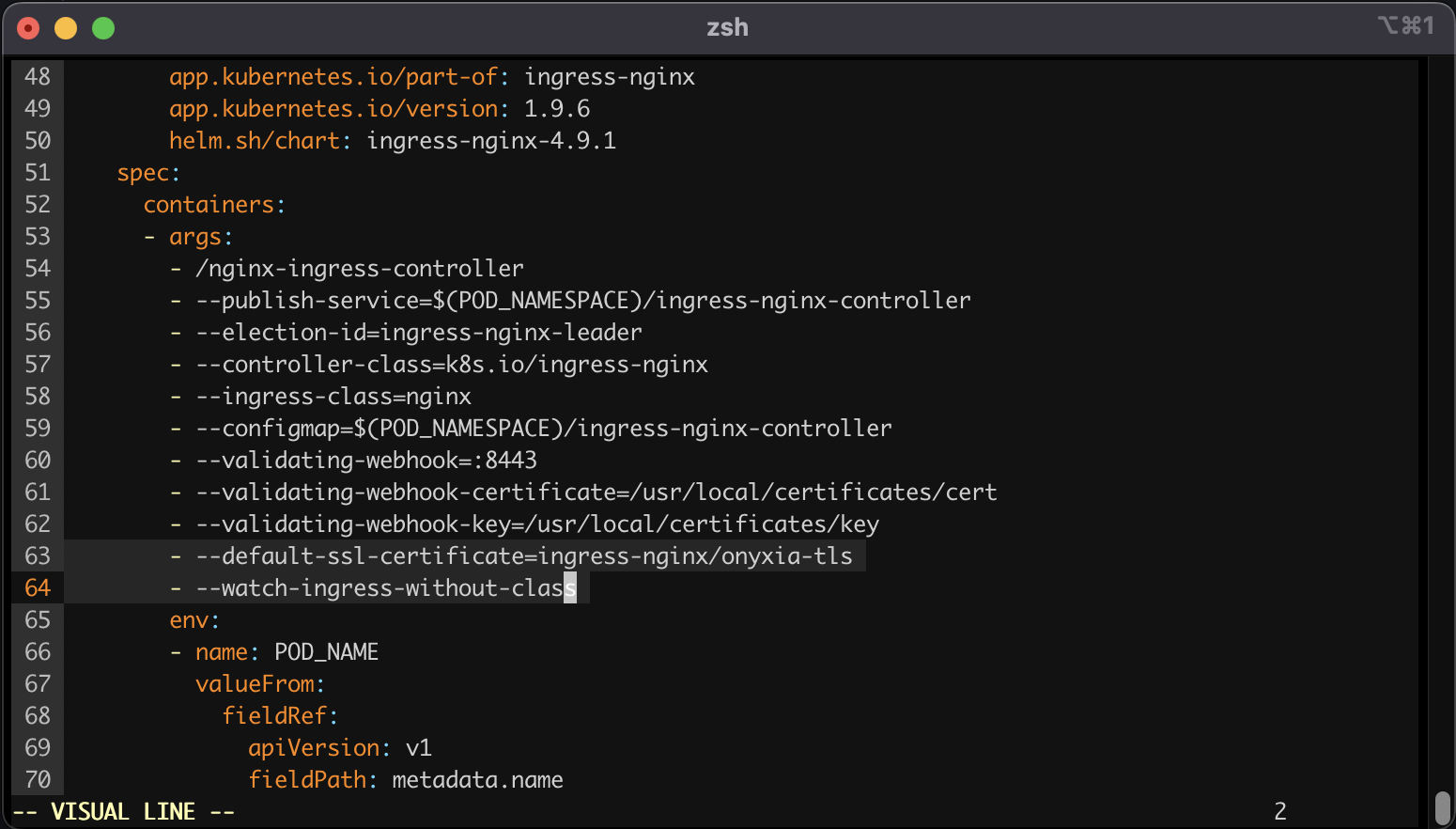 Save and quit. Done π We installed the ingress-nginx in our cluster, (but note that any other ingress controller could have been used as well). The configuration was adjusted to handle all ingress objects, even those lacking a specified class, and to employ our SSL certificate for our wildcard certificate. This strategy facilitated an effortless SSL termination, managed by the reverse proxy for both *.lab.my-domain.net and datalab.my-domain.net, thus removing any additional SSL configuration concerns.